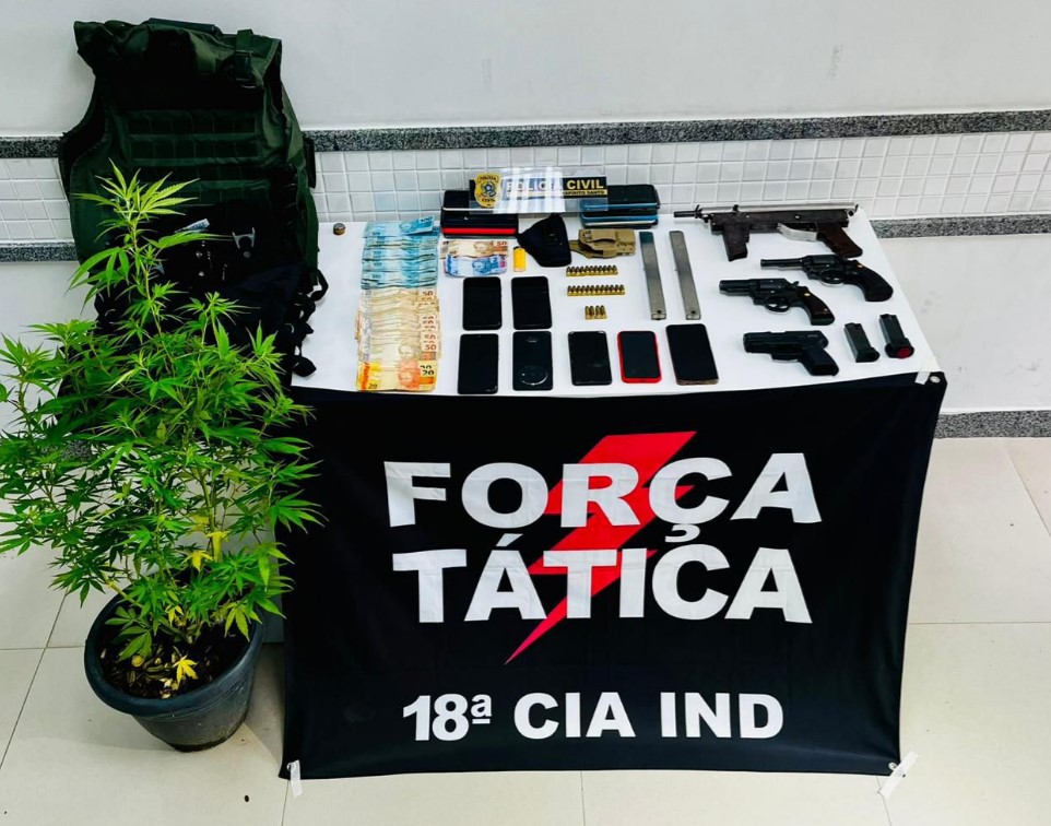 De acordo com informações dos policiais da 18ª Cia, os envolvidos tem mandados de prisão em aberto por tráfico de drogas e homicídios no município. Com eles foram apreendidos dois revólveres calibre 38, uma pistola taurus 9 milímetros, uma submetralhadora e uma grande quantidade de munições de diversos calibres, carregadores, um pé de maconha e mais de 7 mil reais em espécie.