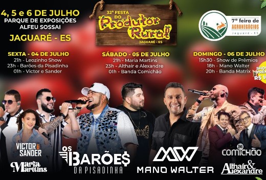 A expectativa é de que a 32ª Festa do Produtor Rural receba milhares de visitantes durante os três dias de programação, consolidando Jaguaré como referência no calendário agrícola e festivo do Espírito Santo.