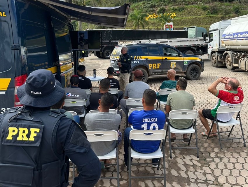 Durante a mobilização, agentes da PRF abordam caminhoneiros para repassar orientações sobre direção defensiva, cuidados com o tempo de direção e descanso, além de reforçar práticas que ajudam a evitar acidentes nas rodovias.
