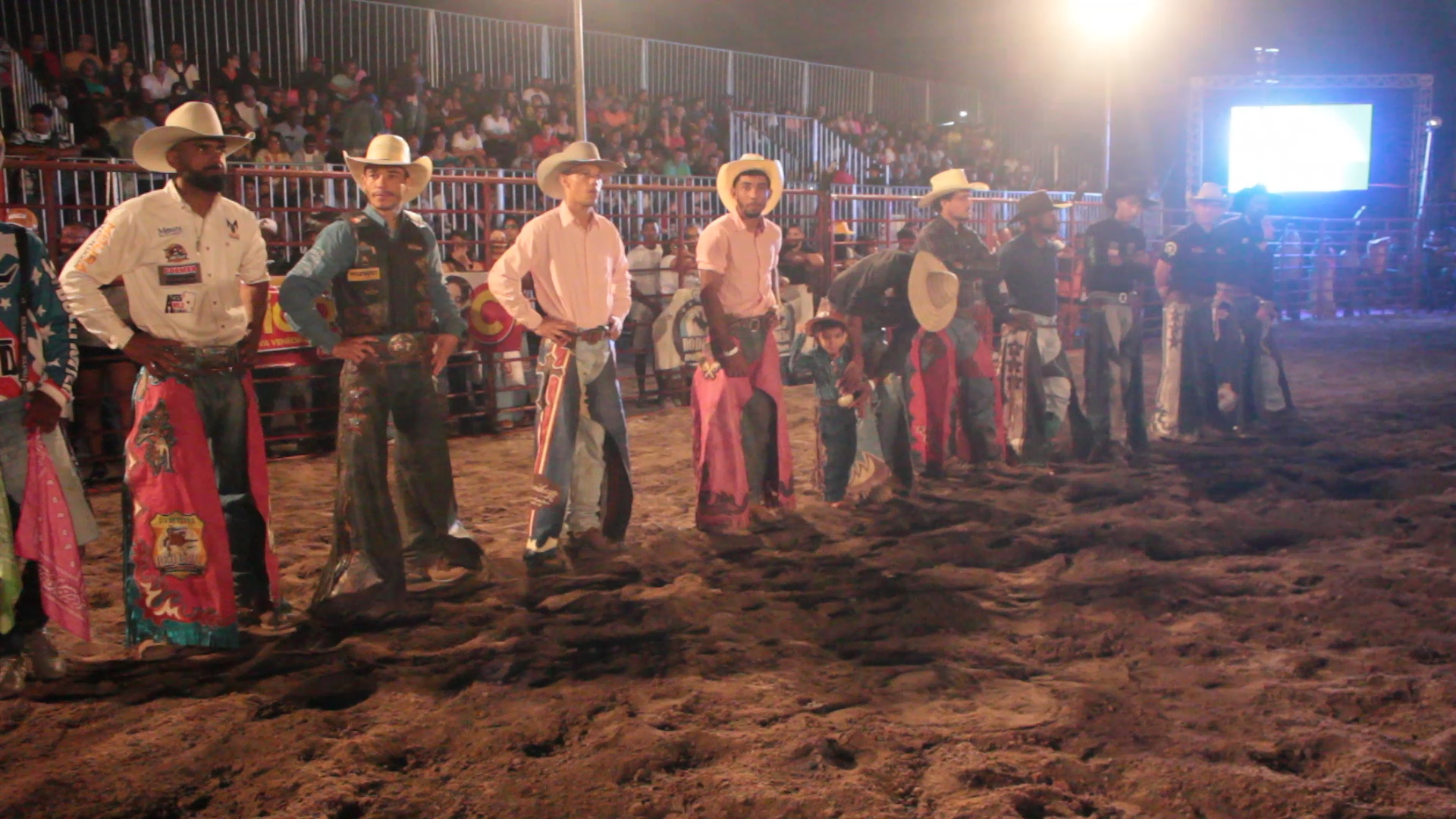 Na arena do rodeio os peões se concentram pra entrar em cena e o público vibra com as apresentações.