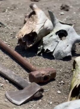 No terreno, os policiais encontraram cerca de 20 crânios de bois e vacas, seis crânios de cavalos e três carcaças de cães, todos em estado de decomposição. Muitos dos ossos apresentavam marcas de golpes, provavelmente feitos com machados e marretas, que foram apreendidos no local.